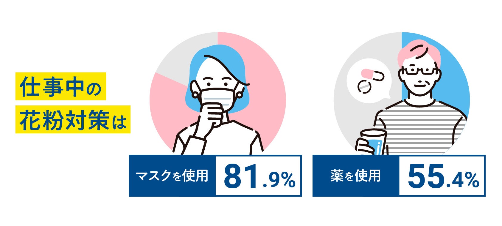 ■ 仕事中の花粉対策について、マスクを使用する人は8割、薬を使用する人は5割。