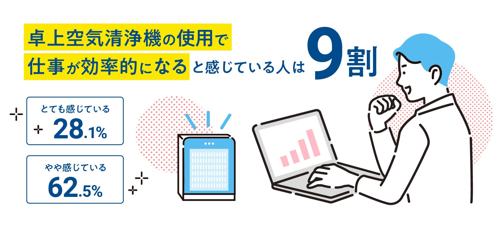 今回の調査結果では、9割以上の人が花粉症で仕事効率が悪くなると感じていることが分かりました。その 一方で、卓上空気清浄機を使う人の9割は仕事効率改善の効果を実感していることも明らかになりました。