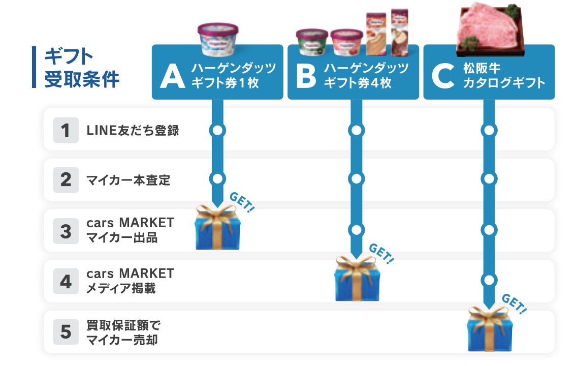 概要: マイカーをcarsにて査定のうえ、cars MARKETへ出品していただくと、条件に応じてハーゲンダッツまたは松阪牛のギフト券(1,000円〜5,000円相当)をプレゼントいたします。