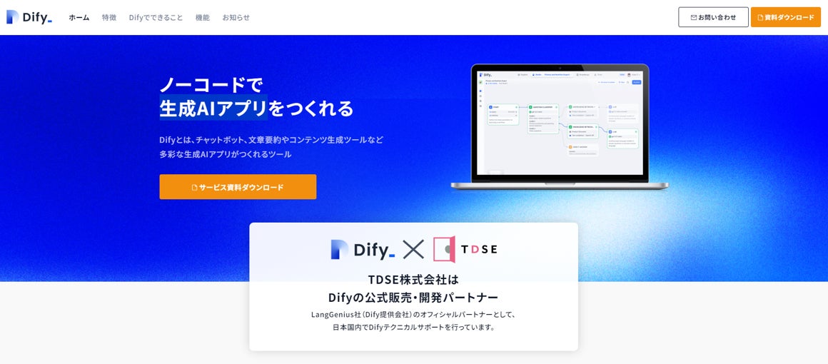 TDSE株式会社(東京都新宿区、代表取締役社長:東垣直樹、証券コード:7046)は、ノーコードで生成AIアプリを開発できる「Dify」のサービスサイトを公開したことお知らせいたします。