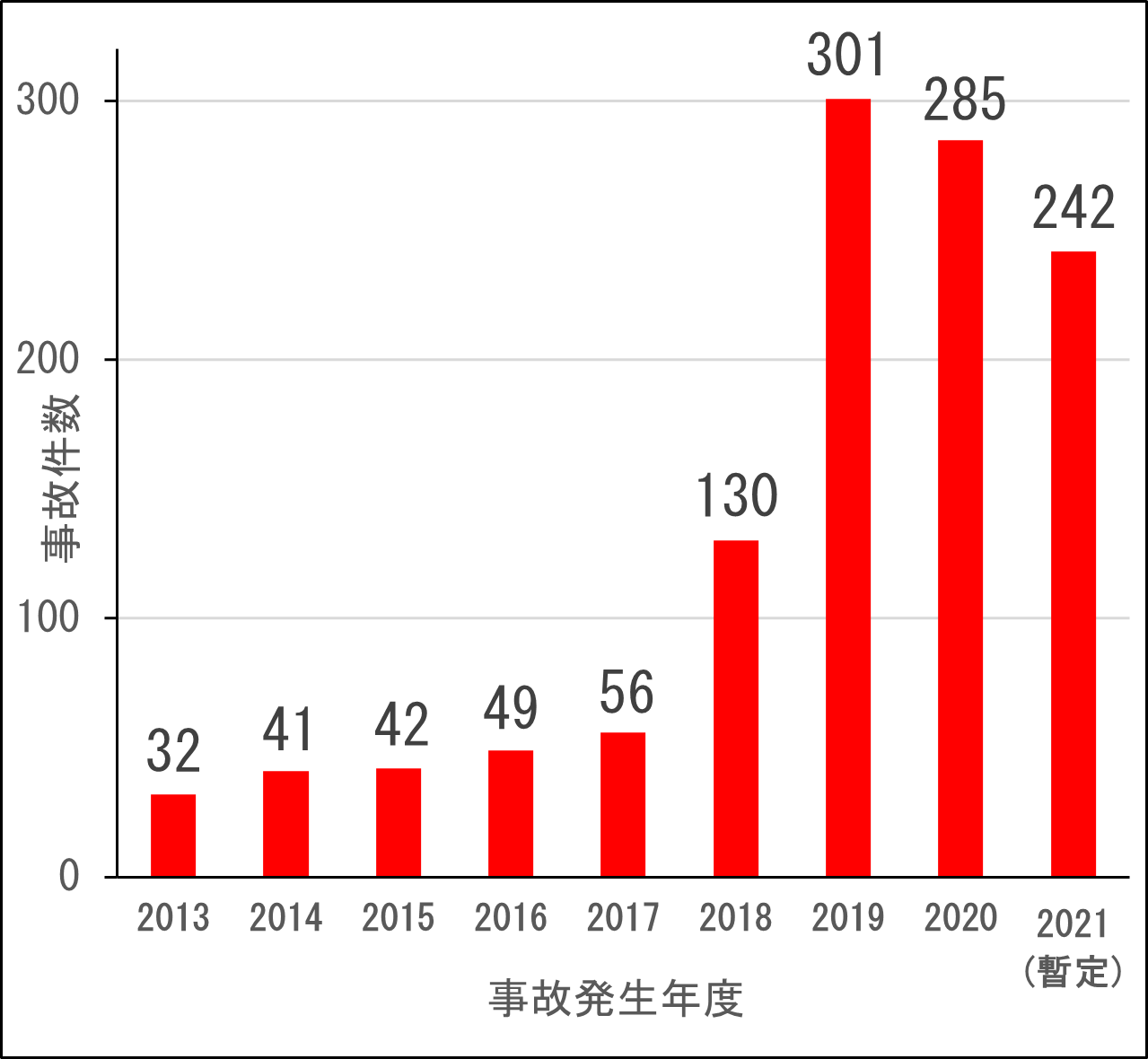 環境省が実施した調査によると、自治体におけるリチウムイオンバッテリーに起因した収集車両や処理施設の火災等の発生状況について、調査対象1,721自治体のうち301自治体が2019年度に火災等が発生したと回答しています※2。また、公益財団法人日本容器包装リサイクル協会の発表によると、プラスチック製容器包装のリサイクル工場での発火事故はここ数年間で急増しています。これらの事故は、モバイルバッテリーや加熱式たばこ等のリチウムイオンバッテリー搭載製品が、処理機の刃等で押し潰されて発生します。発火事故は廃棄物の収集・処理の業務中断を引き起こし、最悪の場合では収集車両や処理施設の焼失に至るなど、多大な社会的損失をもたらします。