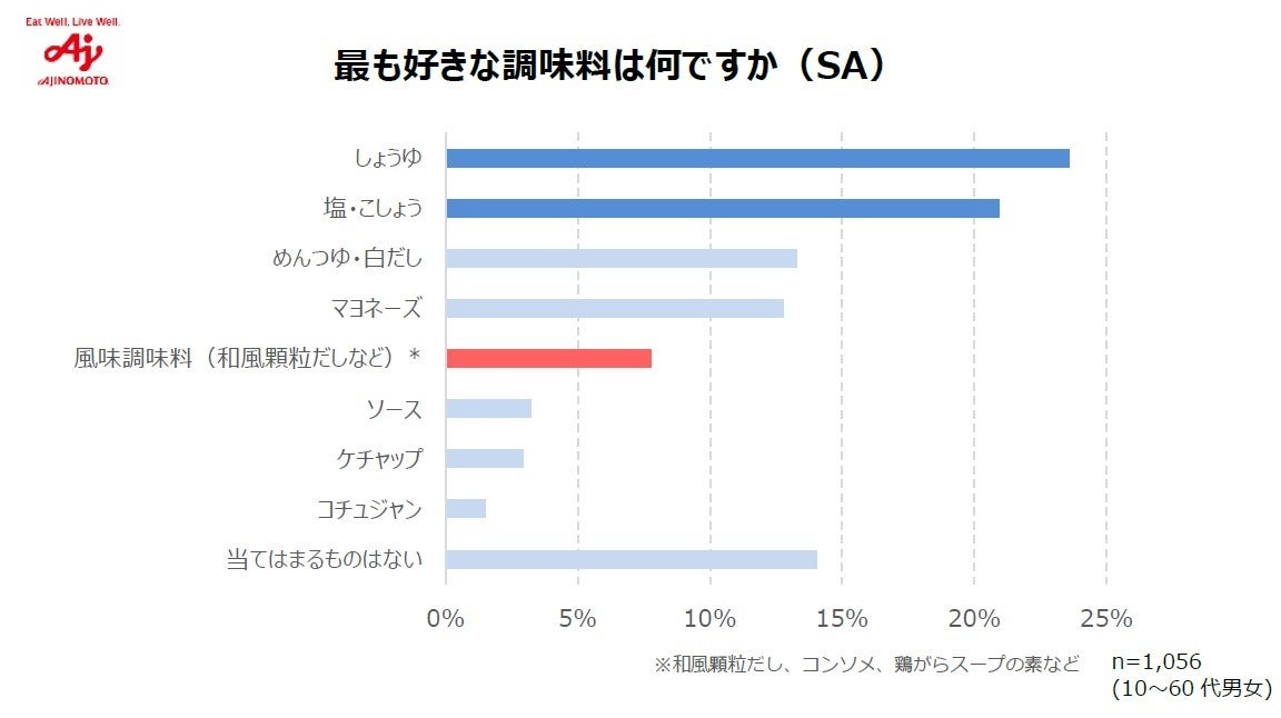 最も好きな調味料としては「しょうゆ」「塩・こしょう」と回答した人が多数を占めました。一方、影の主役の調味料ランキングでは「風味調味料」が2位にランクインしており、地味だが実は料理に欠かせない調味料として認知されていることがわかりました。
