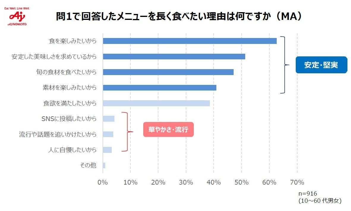 「流行」「SNSへの投稿」を理由とした人はいずれも5%以下と少なく、「食の楽しみ」や「安定した美味しさ」を求めているからという回答がそれぞれ半数以上、「旬の食材」「素材」を食べたい、楽しみたいからという回答がいずれも4割以上となりました。食に対して華やかさよりも安定・堅実が志向され、地に足がついた“地味”な料理が人気を集めていることがうかがえます。