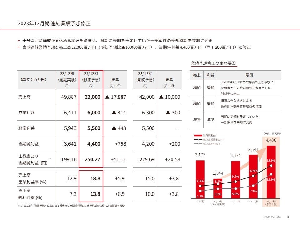 期初より計画していた大型案件等の売却に関する売買契約を締結したことや、期初の想定を上回る利益率の向上、順調な仕入拡大による販売用不動産賃貸収益の増加が見込めること等を踏まえ、当期に売却を予定していた一部案件の売却時期を来期に変更。売上高を下げる一方で、当期純利益を4,400百万円(+200百万円)に上方修正しました。