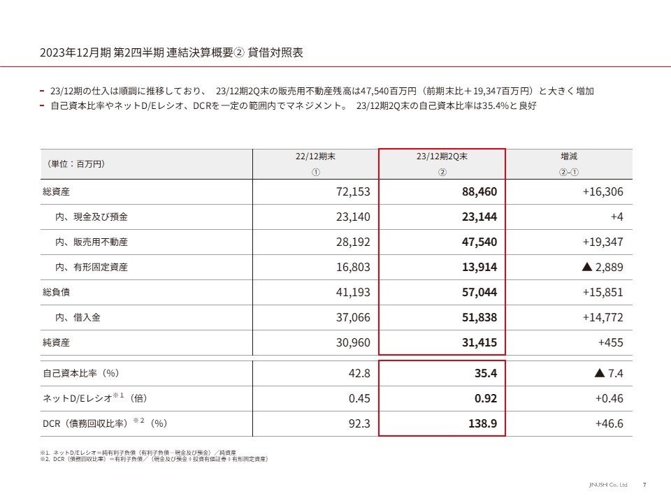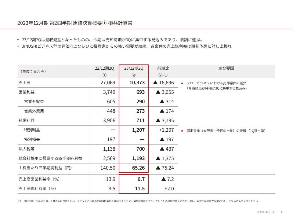 第2四半期は、前年同期比で減収減益となったものの、今期は販売用不動産の売却時期が第3四半期に集中する見込みであり、順調に進捗しています。