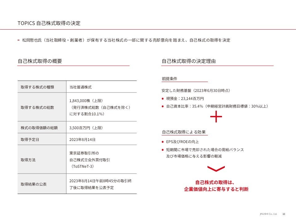 当社取締役・創業者である松岡哲也氏より、保有する当社株式の一部について売却の意向を有している旨の連絡を受けました。当社は、同氏の所有する当社株式を当社が自己株式として取得することが、当社株式が短期間に市場で売却された場合の需給バランス及び市場価格に与える影響の軽減や資本効率の向上に資するものと判断しました。