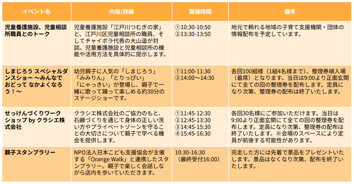特定非営利活動法人チャイボラ(所在:東京都豊島区、代表理事:大山 遥、以下「チャイボラ」)は、オレンジリボン・児童虐待防止推進キャンペーン月間である11月に合わせ、「つなげようオレンジリボン2025~こども達一人ひとりが大切に育てられる世の中を目指して~」をアリオ葛西にて開催いたします。本イベントは、昨年の東京タワーから会場を移し、東京23区で初めて児童相談所を開設した江戸川区内のアリオ葛西を会場に、同区の後援を受けて開催いたします。当イベントでは、児童養護施設や児童相談所の役割について正しい理解を促し、地域の様々な子育て支援情報を伝えることで、孤育てを防ぐことを目的としています。子育て世代が多く利用するアリオ葛西を会場とすることで、ニーズの高い層に直接アプローチすることを目指します。