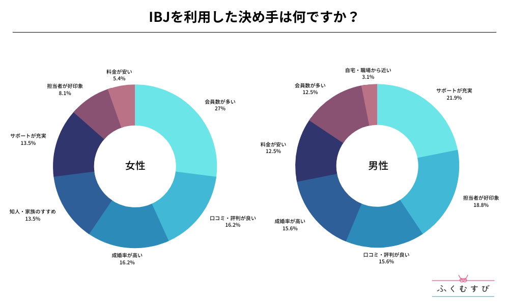 ・女性がIBJを利用した決め手は、会員数が多いが1位、口コミ・評判が良いが2位となりました。