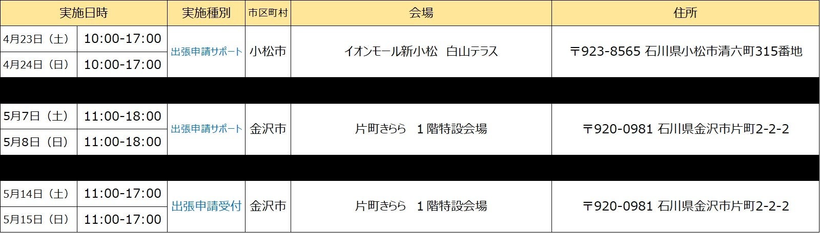 ※開催場所の調整状況や新型コロナウィルスの感染状況等により、「出張申請受付」及び「出張申請サポート」の開催を中止・延期、または実施内容が変更となる可能性がございます。