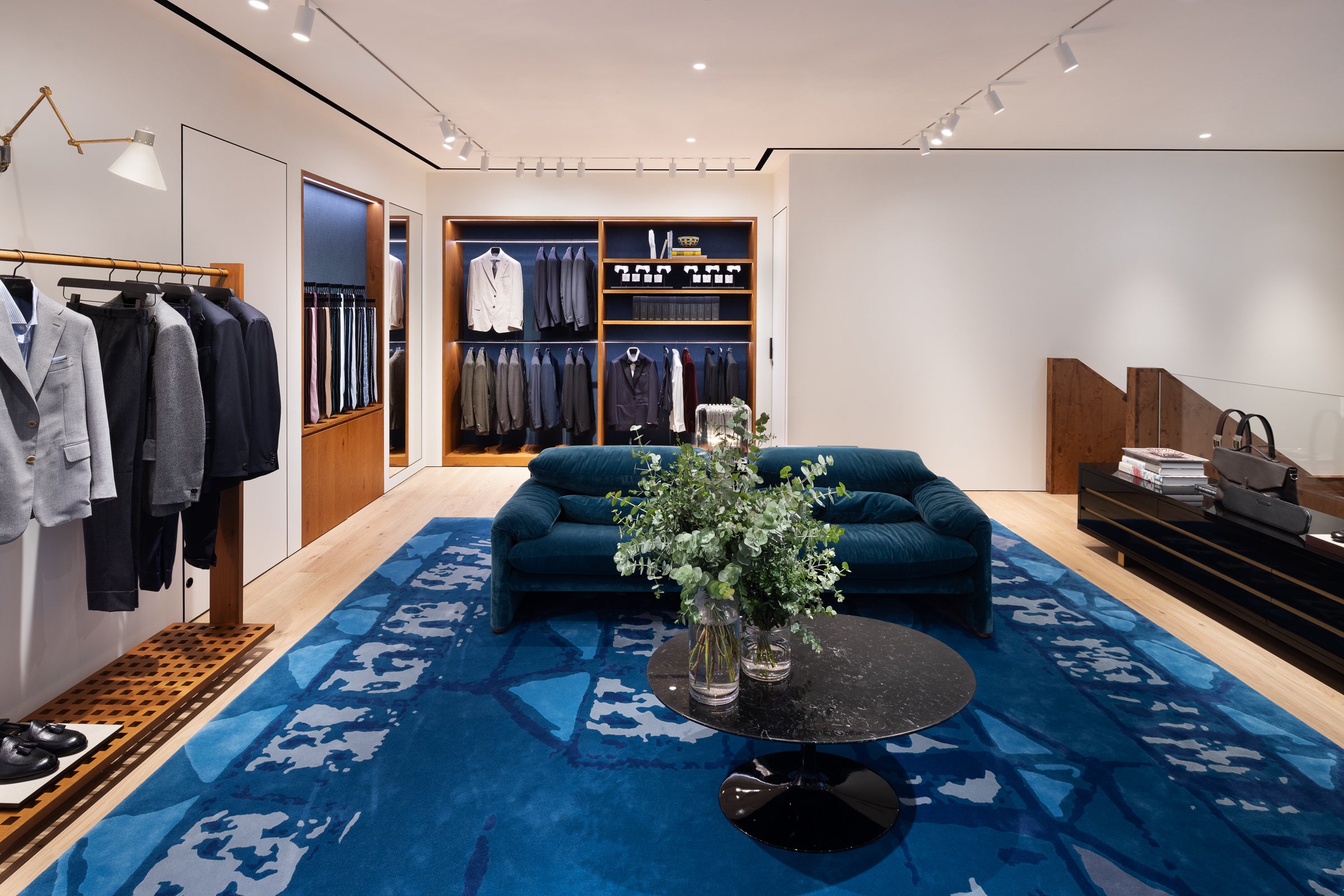 東京を象徴する洗練されたエリア、六本木ヒルズに誕生する本ブティックは2フロア構成でイタリアのサルトリアの伝統と日本の建築美が融合した洗練された世界観が広がります。店内には、トラバーチン大理石や天然木など自然素材を用いた穏やかなインテリアが施され、1950~1970年代のイタリアンヴィンテージ家具や、日本人アーティスト花房壽夫氏によるヴィンテージテーブルが配されています。イタリアと日本の美意識が心地よく調和した空間です。