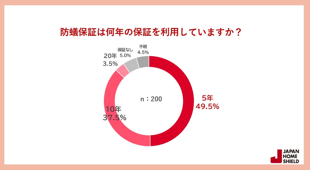 2.「防蟻保証期間」は、「5年」が49.5%、「10年」が37.5%、「20年」が3.5%という回答になりました。