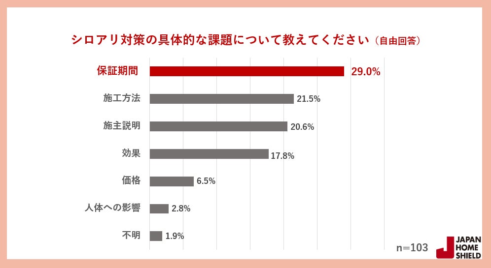 シロアリ対策で課題点や改善したい点で最も多かったのは「保証期間(29.0%)」で、次いで「施工方法(21.5%)」という回答になりました。