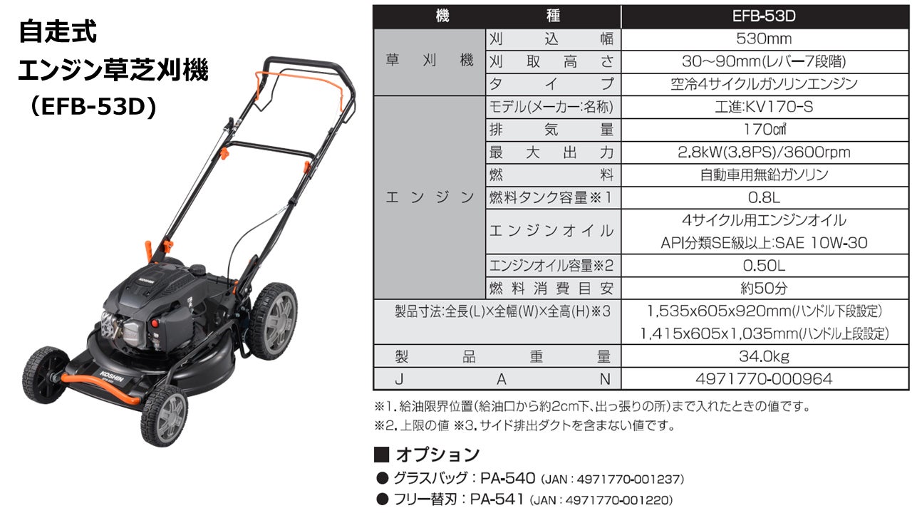 (*1)【走行スピード】前年モデル:3.3 km/h ⇒エンジン草芝刈機(EFB-53D):3.0 km/h