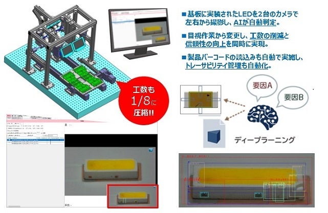 実装基板等の微細な問題を検出する装置です。展示では、実装基板上のLEDを2台のカメラで左右から撮影し、クラックや欠けをAIにより自動検出する装置を実演します。LED基板の実装後の不具合を検出するとともに工数も1/8に圧縮できる検査プロセスとして訴求します。