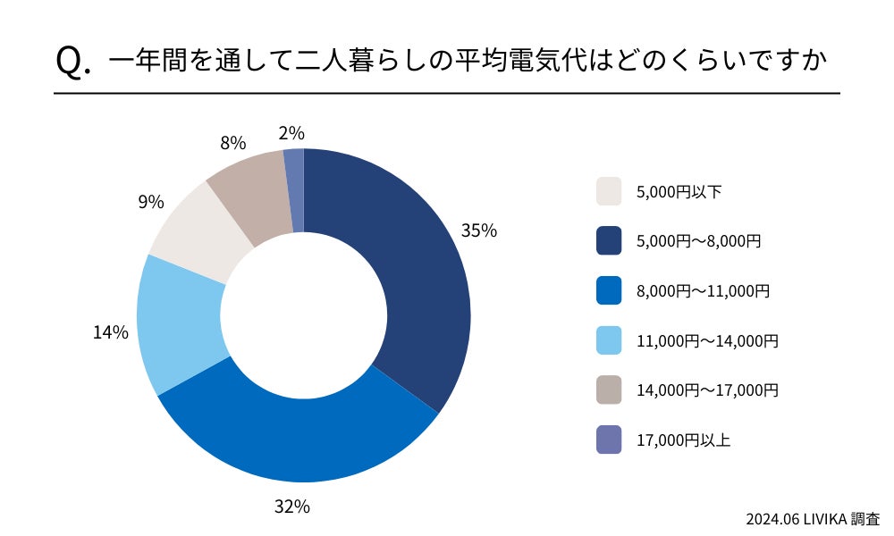 関東地方の二人暮らし世帯に、1年を通して月の平均電気代はいくらか調査したところ、35%が5,000円~8,000円、続いて僅差で32%が8,000円~11,000円と回答しました。