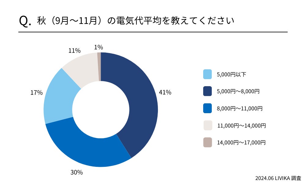 秋も他の季節と同様に、電気代が5,000円から8,000円であると回答した割合が41%と最も多くなりました。次いで、30%が8,000円から11,000円と回答しており、約7割の回答者が1ヶ月の電気代は11,000円以下と回答しています。
