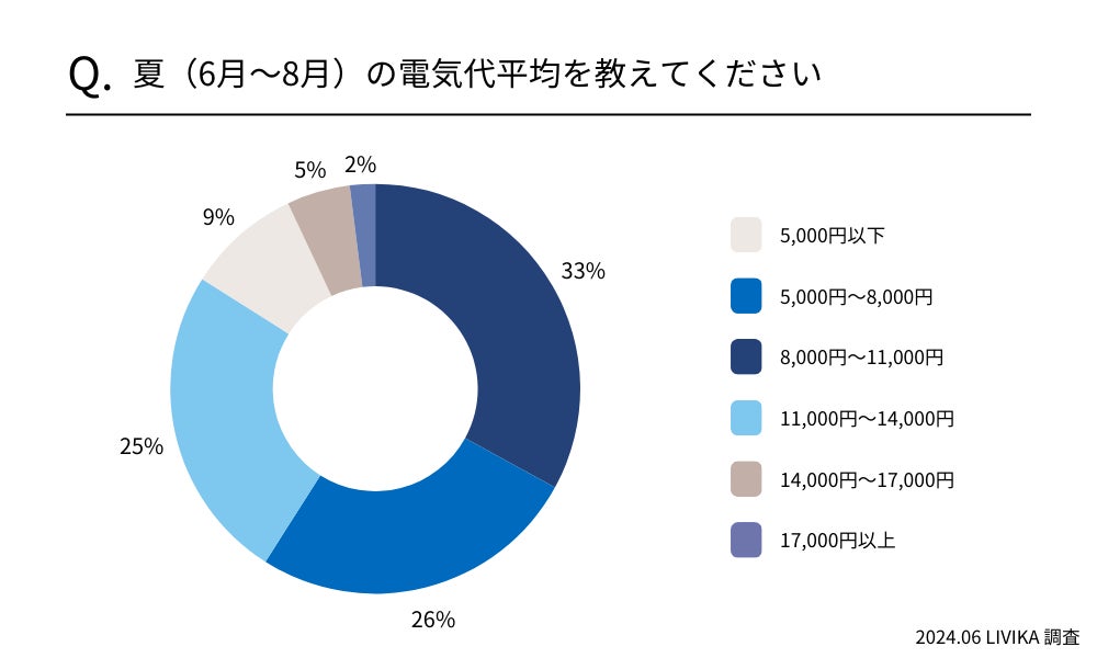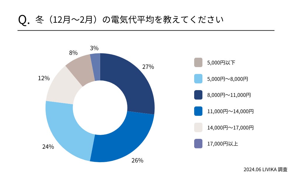 夏はエアコンなど冷房機器の使用も増えることから、他の季節に比べて電気代が上がる傾向にあります。グラフから、他の季節に比べて11,000円~14,000円の回答が増加していることが分かります。
