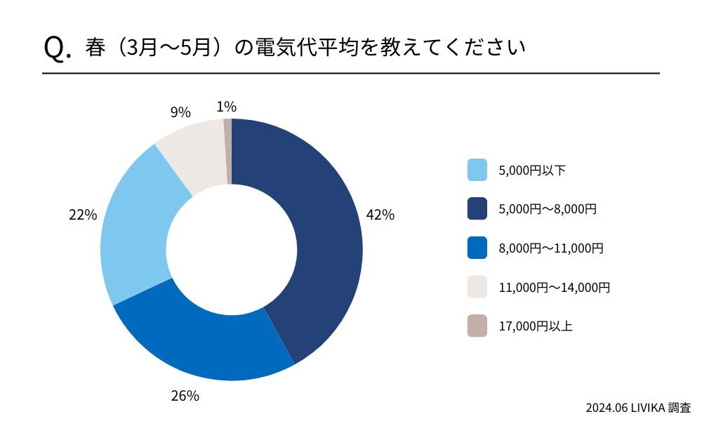 春(3月~5月)の平均電気代は、5,000円〜8,000円が42%、8,000円〜11,000円が26%と、11,000円以下の電気代のご家庭が約9割を占める結果となりました。