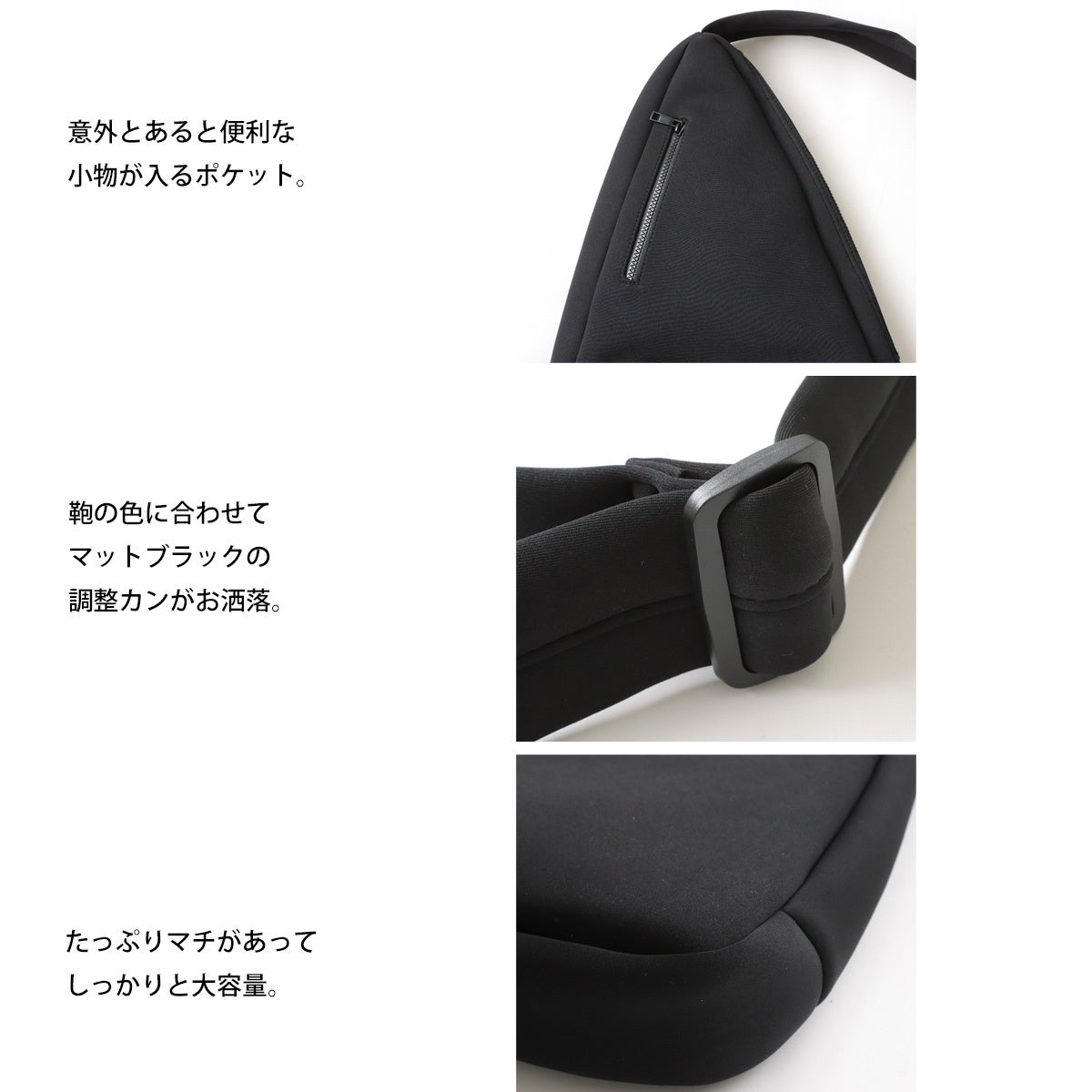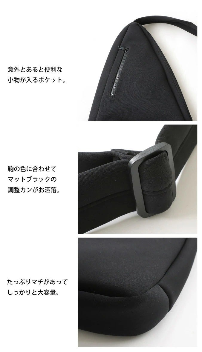 あると便利な小物用ポケットや、バッグの色にあわせたマットブラックの調整カン付き。A4サイズが入るだけでなく、たっぷりとマチがあり大容量なので通学にもぴったりです。