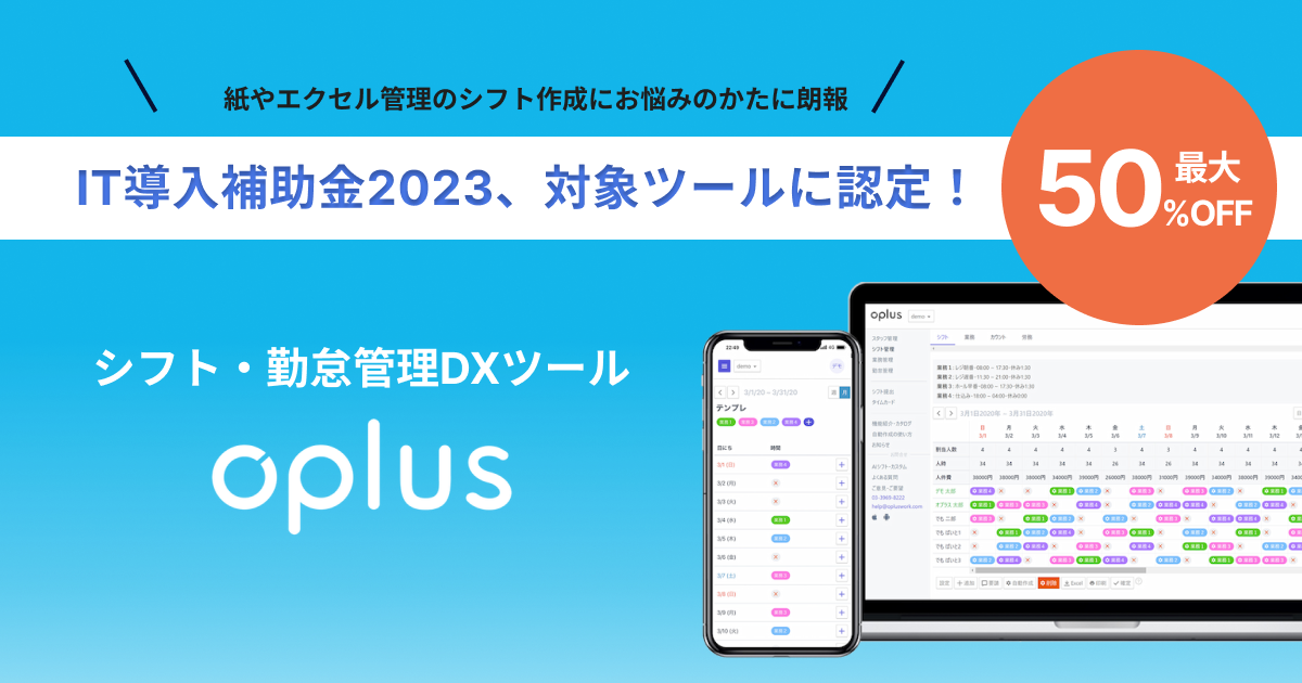 シフト・勤怠管理DXサービス「oplus」がIT導入補助金の対象サービスに認定!最大50%の利用料金が補助。シフト業務の効率化をサポート