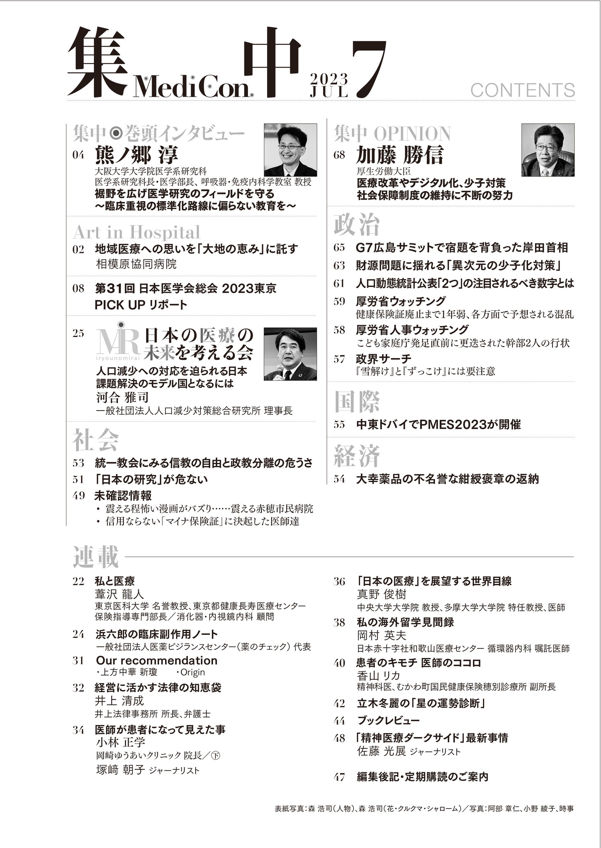 医療情報誌月刊『集中』2023年7月号 巻頭インタビュー 熊ノ郷淳・大阪大学大学院 医学系研究科長・医学部長/集中OPINION 加藤勝信・厚生労働大臣 他