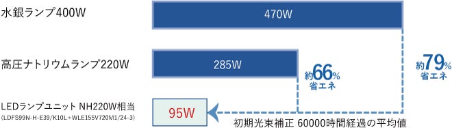 ※3 水銀ランプ400W(消費電力470W)と、LEDランプユニット(消費電力95W (LDFS99N-H-E39/K10L+WLE155V720M1/24-3))との比較。
