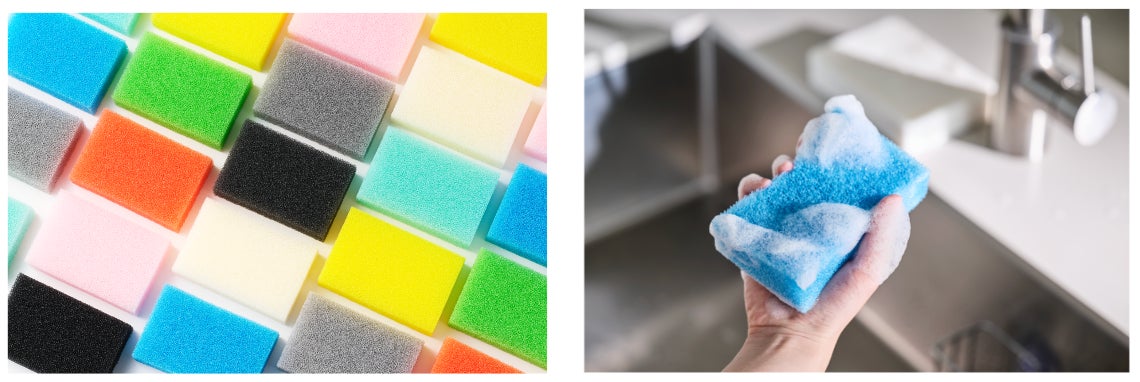 ダイニチ・コーポレーションは創業から、食器洗い用固形洗剤の製造販売を行っています。製造から販売を行う中で、固形洗剤と相性の良いスポンジを研究し、高品質ポリウレタンを使用した、従来のスポンジの概念を覆す「サンサンスポンジ」が生まれました。半年以上使えるほど丈夫で長持ちなので、ごみの削減に。