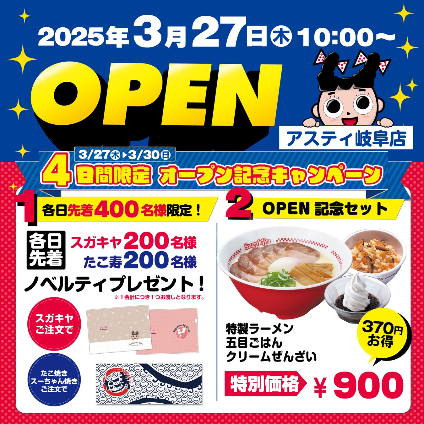 オープンを記念し、スガキヤの代表商品がお得に食べられるOPEN記念セットを4日間限定で販売いたします。