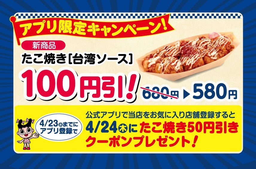 4月17日(木)〜4月23日(水)の期間中、たこ焼きの新商品「台湾ソース」を100円引きでご購入いただけるお得なクーポンをプレゼントいたします。