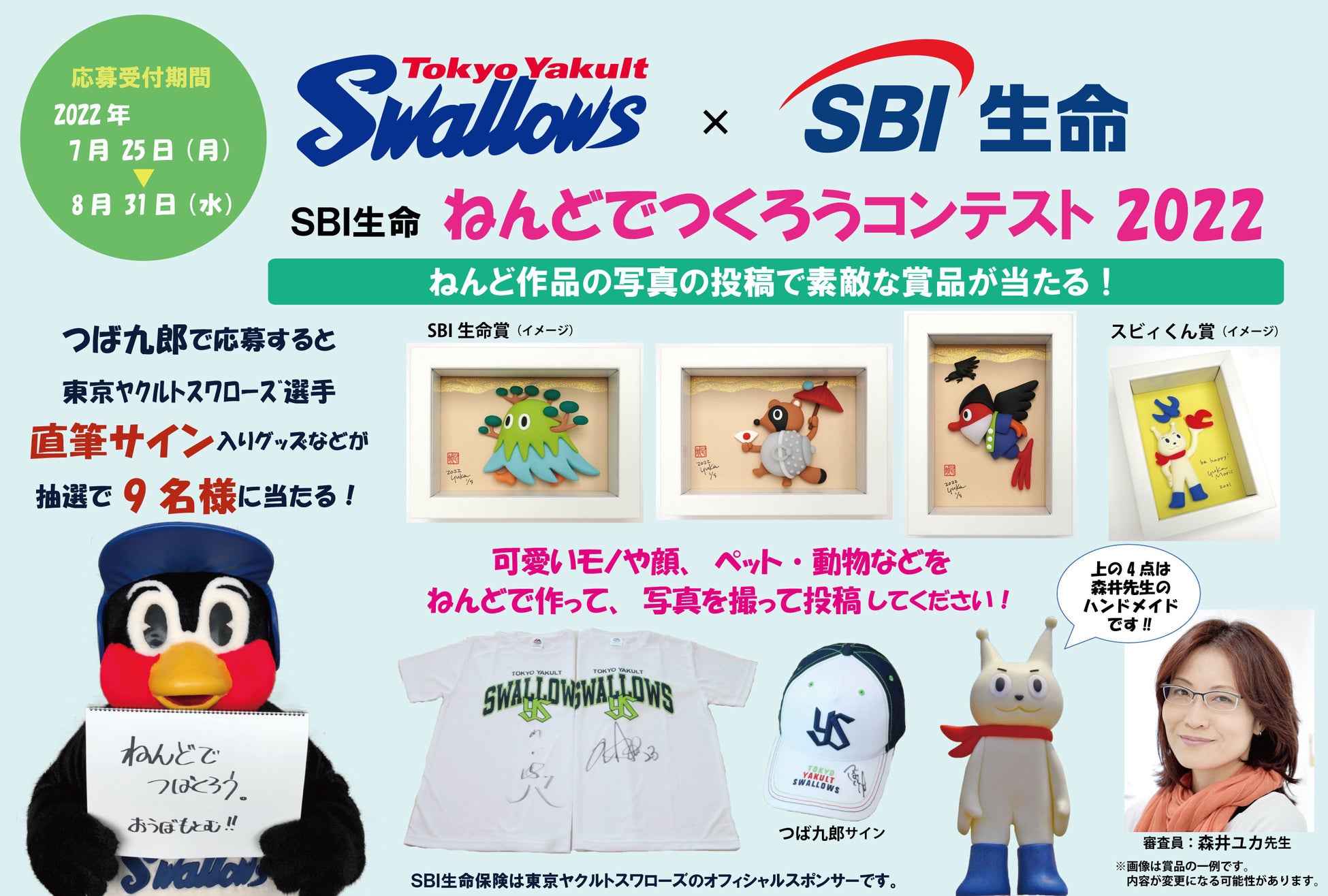 ご自身や周りの人達が「楽しくなる」「ハッピーになる」可愛いモノやコトなどをテーマとしたねんど作品の写真のほか、当社マスコットキャラクター「スビィくん」や、当社がオフィシャルスポンサーを務める東京ヤクルトスワローズの公式マスコットキャラクター「つば九郎」のねんど作品の写真を募集いたします。第5回となる今回もこれまで同様、審査員に造形作家の森井ユカ先生を迎え、ご応募いただいた方の中から選考・抽選の上、素敵なプレゼントを進呈いたします。また、今回も応募作品数に基づき算出した金額を公益財団法人SBI子ども希望財団へ寄付する予定です。
