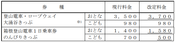 ※2 「箱根フリーパス」を含む上記以外の企画乗車券の料金改定は実施しません。