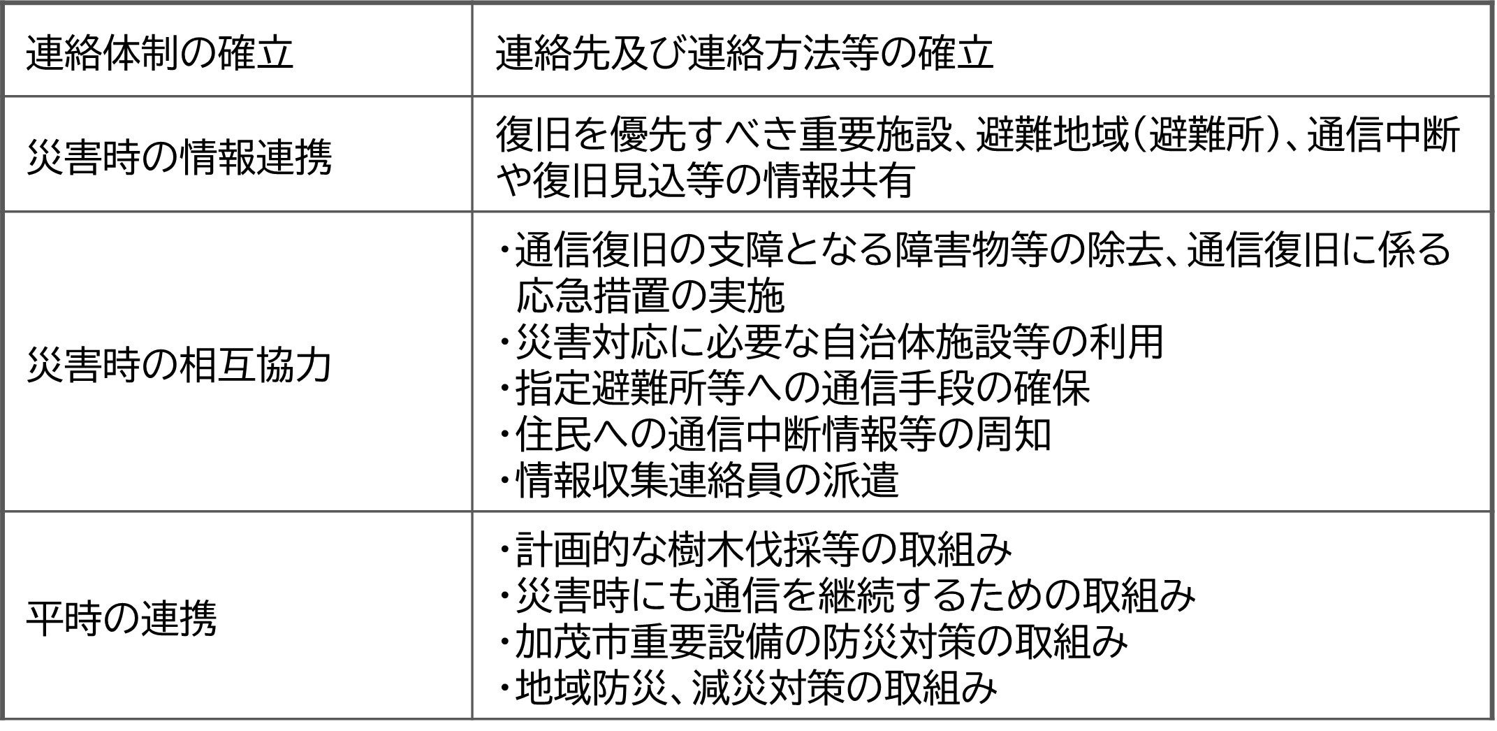 本協定の締結に基づき、加茂市とNTT東日本は災害時はもとより平時から緊密に連携し、地域防災・減災の課題解決に向けた住民参加のワークショップの開催をはじめとする様々な取組みを通じ、地域の防災力向上に取り組んでまいります。