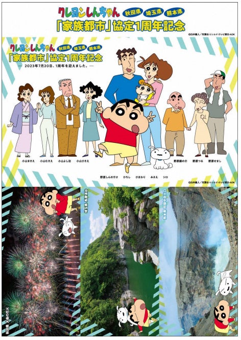 「家族都市」協定は、しんちゃんのお父さん・ひろしの出身地である秋田県、お母さん・みさえの出身地である熊本県、しんちゃんたちが暮らす埼玉県を結んで、日本中が元気になるようなことをしたい!という野原一家からの呼びかけによって、2022年7月20日に締結されたものです。しんちゃんを中心とする『家族』として力を合わせ、三県の観光振興と地域活性化、相互交流施策に取り組んでいます。