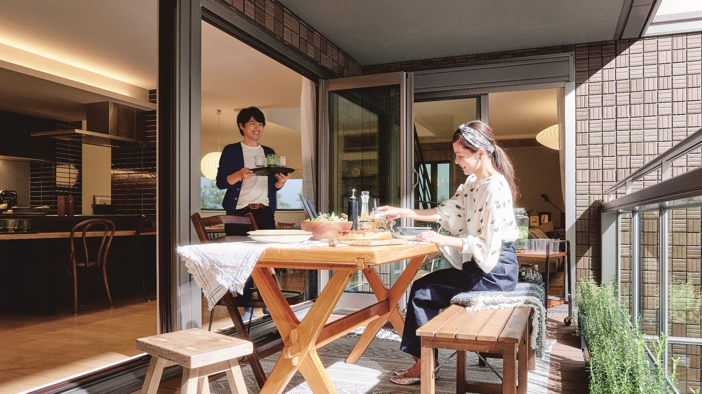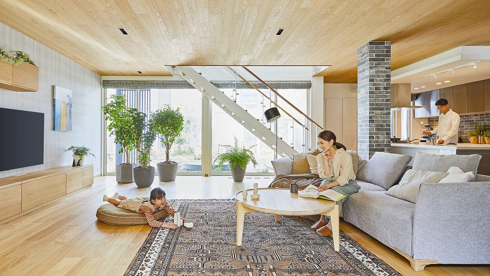 人生100年時代に備え、在宅時間を安心・快適に過ごすことを目指した住まい。快適な室内空気・温熱環境を確保する「快適エアリーT-SAS」に加え、清潔に過ごせる建材や間取りの工夫、在宅ワークスペースの確保、「庭育」にも活用できる「うちそと空間(テラスや庭)」など、豊かな住空間を提案しています。