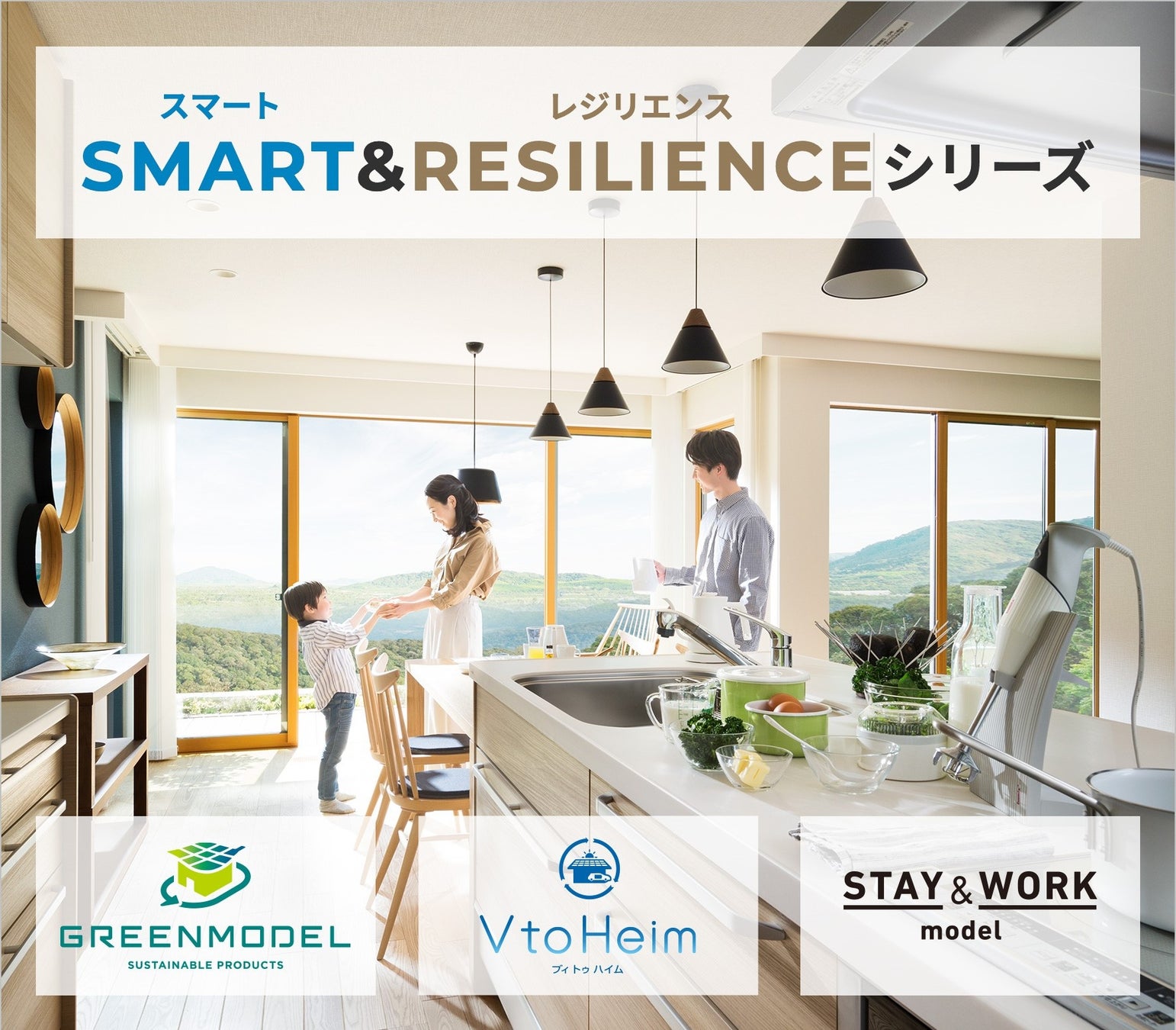 『SMART&RESILIENCEシリーズ』は、大容量の太陽光発電システムや蓄電池、全室空調システムなどの先進技術により、安心・快適な暮らしを実現する当社の戸建住宅モデル「GREENMODEL」、「VtoHeim」、「STAY&WORKモデルTS」の総称です。