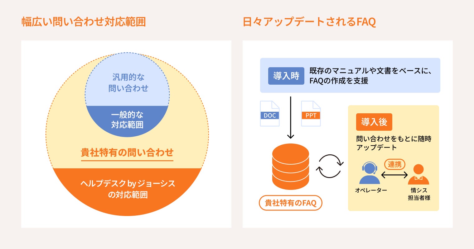 当社は、ジョーシスの機能を併用する事で、問い合わせ対応の効率化を可能にし、企業規模問わず各社固有のFAQに対応し、アウトソーシングできる仕組みを構築しました。