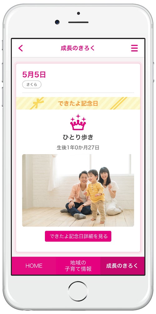 育児日記として使用できる「できたよ記念日」は、厚生労働省の母子健康手帳様式例などを元に作成し、母子健康手帳の「保護者の記録」を含む発達段階や子育てにかかわる記念日を写真やメッセージと共に記録できるだけでなく、子どもの成長・発達の目安としての役割も備えています。