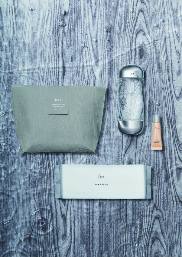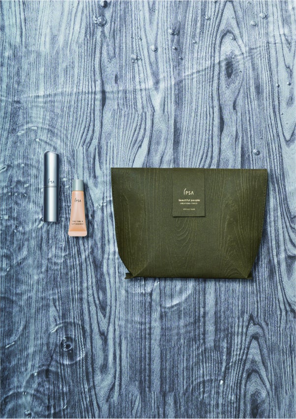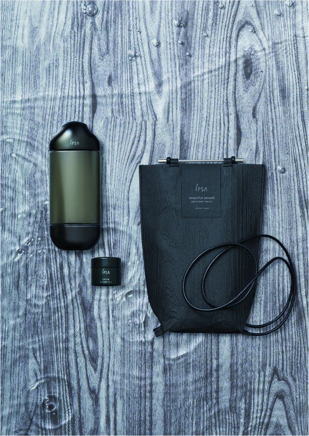 今回、 beautiful peopleでは、人も自然もひとつとして同じものはなく、ひとときが織りなす美しさを持つという考えにより、広大で様々な表情が移ろう自然の象徴として、「水面」を通して「木目」、「イプサのエレメンツ(=商品)」を写すことで、新たな美しさである“歪み”や“ゆらぎ”を生み、その人自身に存在する「無限の可能性」を表現。そして、そこから着想を受けた特別な 『コスメバッグ』 と 『ショルダーポーチ』 が完成しました。