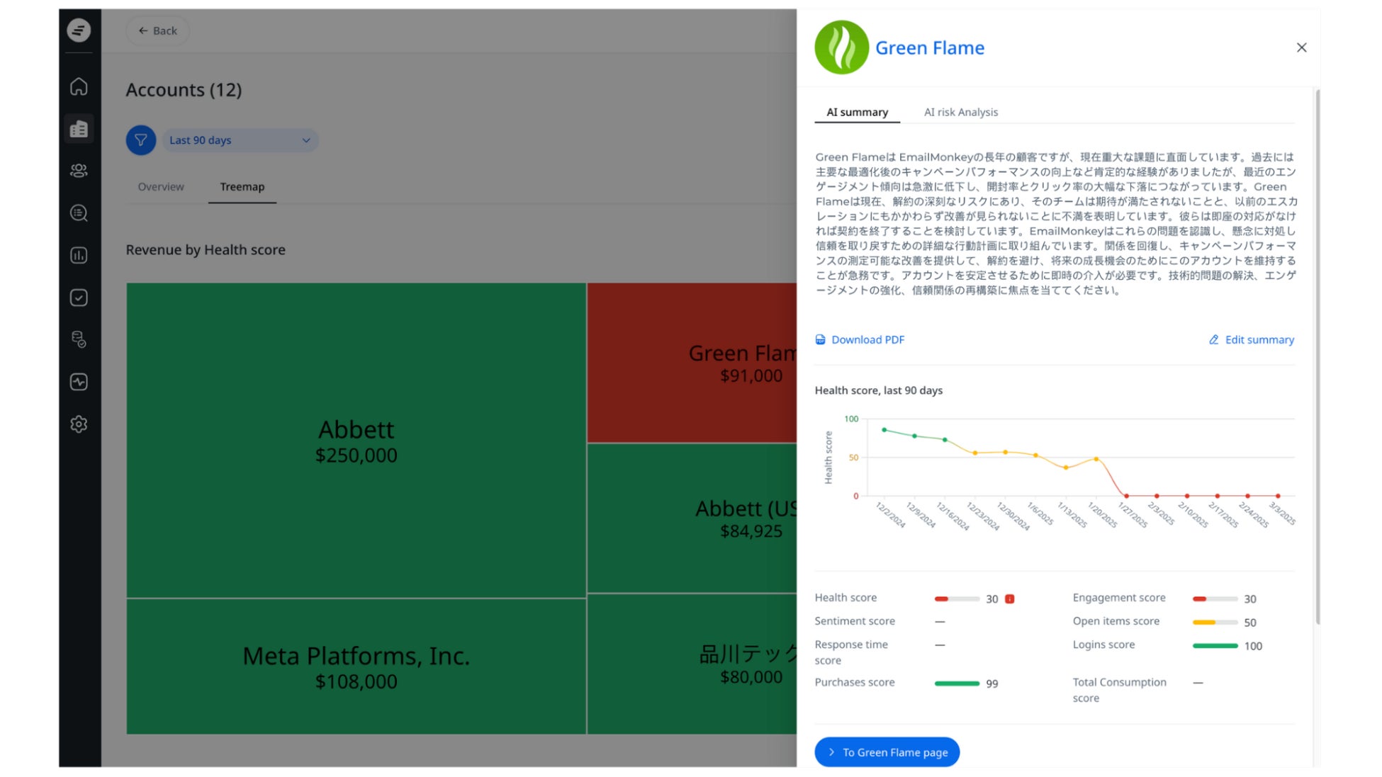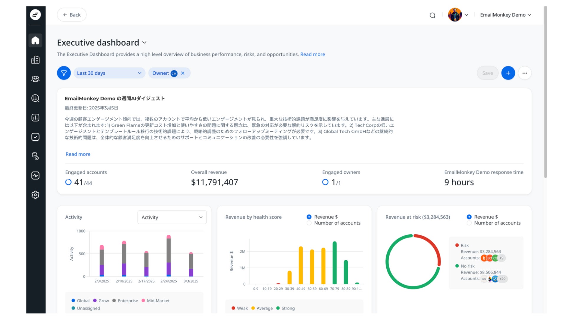 エグゼクティブ向けダッシュボードで、カスタマーヘルスや対応パフォーマンスを可視化