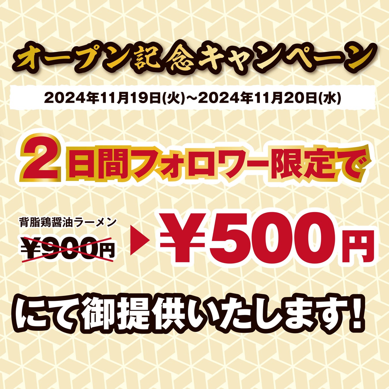 ①Instagram公式アカウントをフォローした方限定で、2024年11月19日(火)~2024年11月20日(水)の2日間で「背脂鶏醤油ラーメン(¥900)」をワンコイン500円でプレゼント!