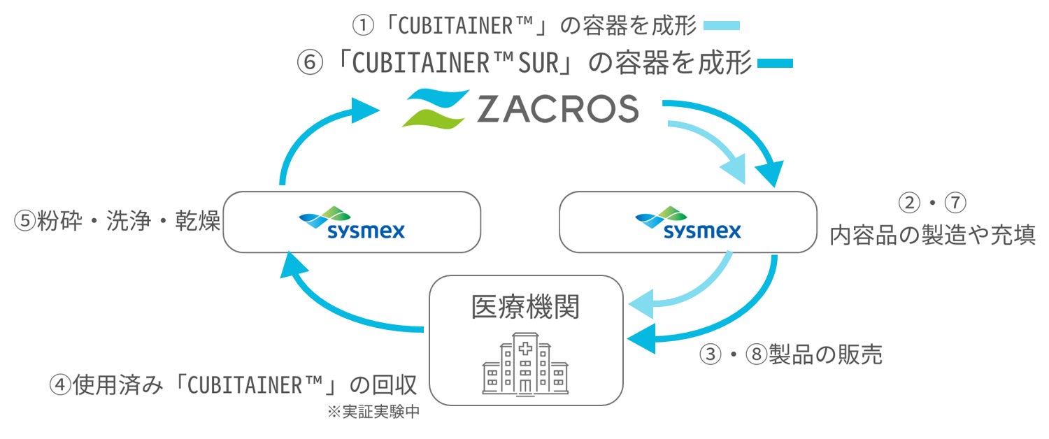 近年、持続可能な社会の実現に向けて、プラスチック製容器包装の環境負荷低減が国際的な課題となっています。EUでは 2030 年までにすべての包装をリサイクル可能な設計にする規制が発表され、日本では「プラスチック資源循環促進法」が 2022 年に施行されました。ZACROSはマテリアリティ(重要課題)の一つとして「持続可能で豊かな未来の創造」を掲げ、「環境配慮型社会の実現」に取り組んでいます。その取り組みの 1 つが、プラスチックの循環を促進させる、新たなリサイクル技術の開発です。この度、 2019 年より開発を進めてきた(※5)「CUBITAINER™SUR」がシスメックスに採用されました。