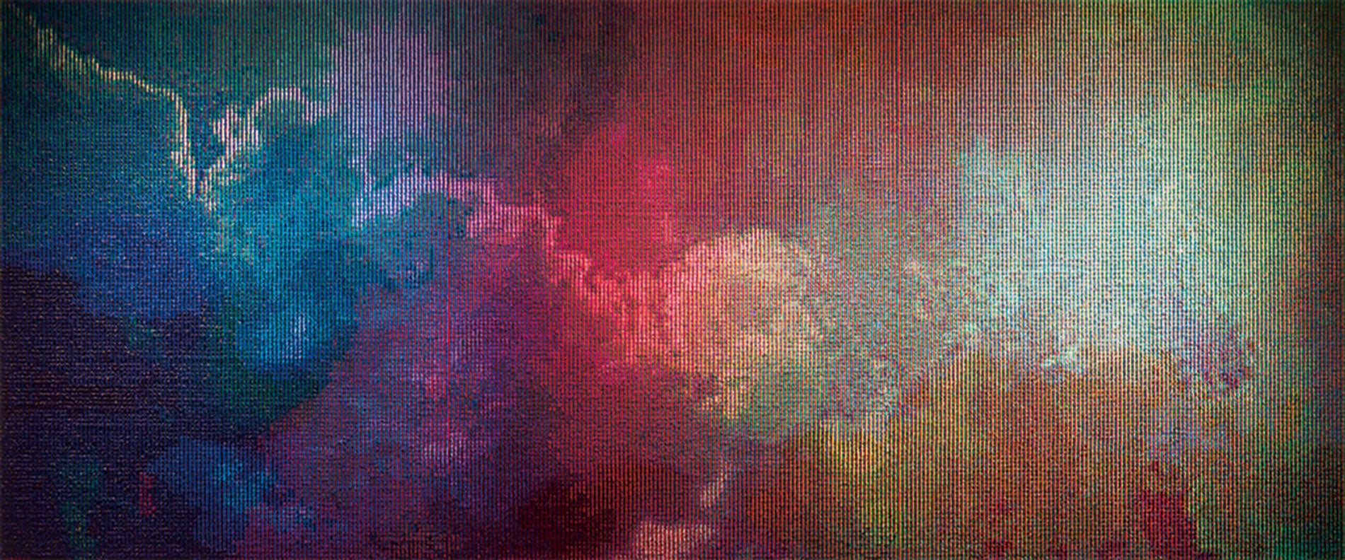 現行のメディアである液晶ディスプレイはプリズム分光の構造を前提としており、 赤と緑と青の発光によって色彩を表現している。 それは人間の眼に適切に映るように作られた構造だが、本質的に光は白色光の構造色のみの理解では不十分といえる。ただ、その性質を十分に理解するためには感覚を頼りにするほかなく、その上、視覚の外側に目を向けるのは難しい。光が光らしい形を持って色彩を作り出すのだとすれば分光した状態で解体し、再構成する事で光を実際に見たときの捉えどころのなさを映し出せるのではないか。 3原色に解体された光のイメージは統合されることによって空間的な重なりを持ち、さらにそのイメージに分光したそれぞれの光を当てることで光は収束と分光の両方の状態を同時に保ちながら何色とも取れない色彩に変化する。 その表面には色材の色と光の色が同調と飽和を湛え何色でもない光本来の色彩へと還ってゆく。