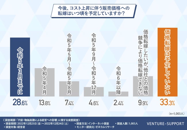 - コスト上昇に伴う販売価格への転嫁の時期は、「令和5年3月までに」と考えている経営者が28.6%