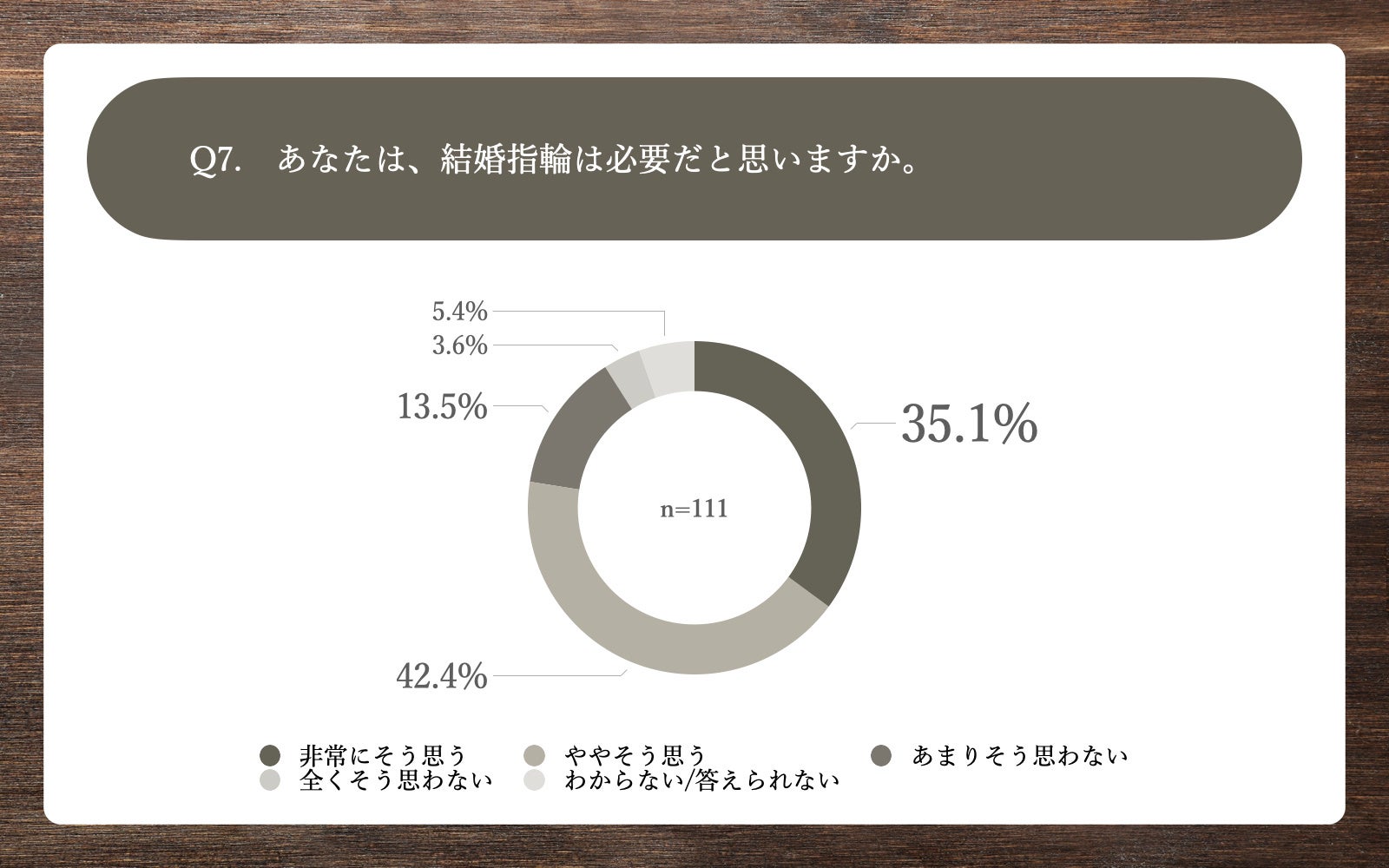 「Q7.あなたは、結婚指輪は必要だと思いますか。」(n=111)と質問したところ、「非常にそう思う」が35.1%、「ややそう思う」が42.4%という回答となりました。