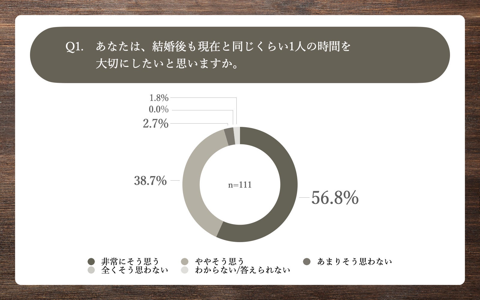 「Q1.あなたは、結婚後も現在と同じくらい1人の時間を大切にしたいと思いますか。」(n=111)と質問したところ、「非常にそう思う」が56.8%、「ややそう思う」が38.7%という回答となりました。