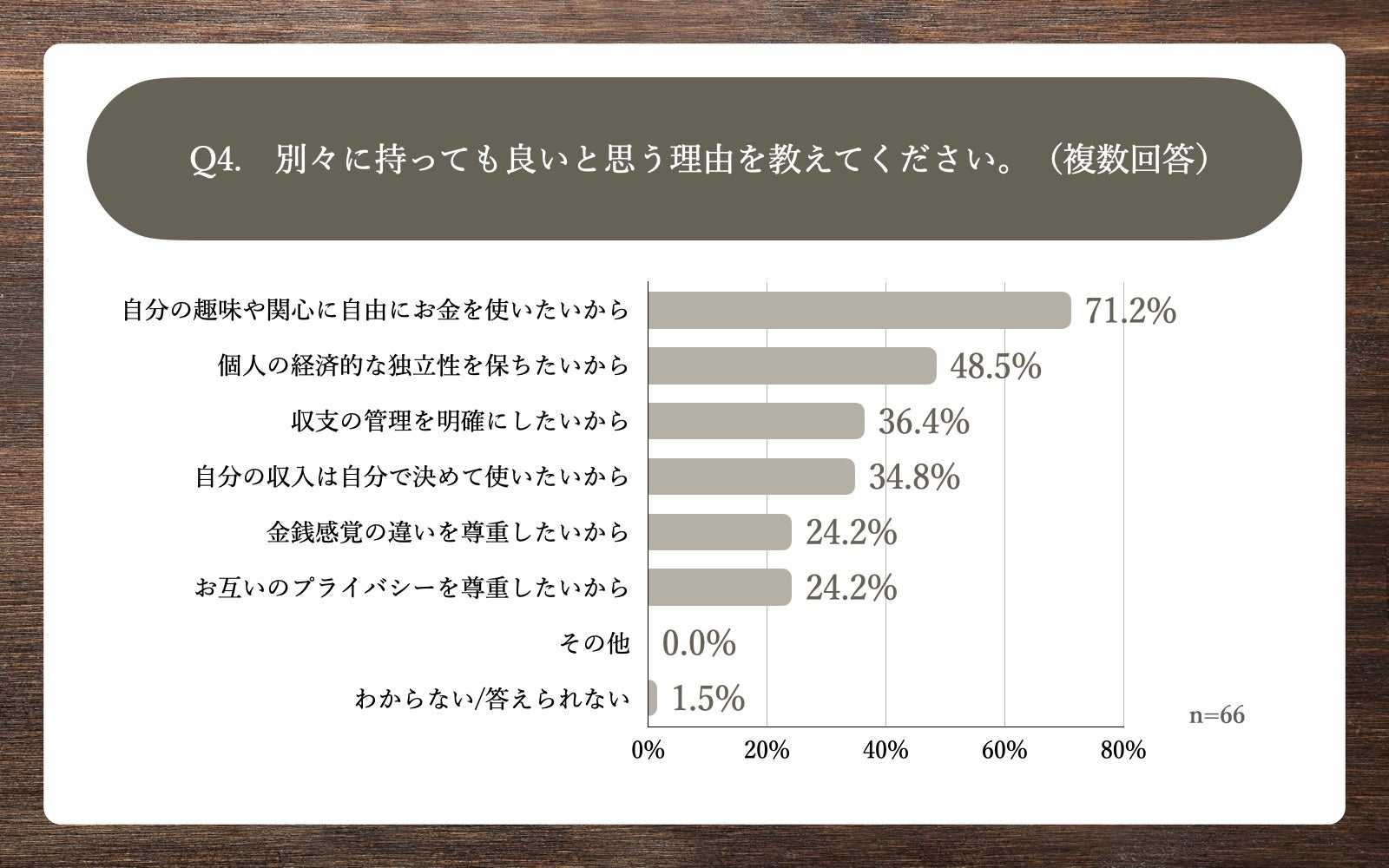 Q3で「財布(お金の管理)」と回答した方に、「Q4.別々に持っても良いと思う理由を教えてください。(複数回答)」(n=66)と質問したところ、「自分の趣味や関心に自由にお金を使いたいから」が71.2%、「個人の経済的な独立性を保ちたいから」が48.5%、「収支の管理を明確にしたいから」が36.4%という回答となりました。