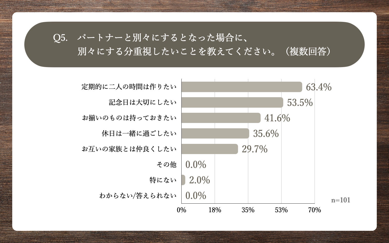 Q3で「特にない」「わからない/答えられない」以外を回答した方に、「Q5.パートナーと別々にするとなった場合に、別々にする分重視したいことを教えてください。(複数回答)」(n=101)と質問したところ、「定期的に二人の時間は作りたい」が63.4%、「記念日は大切にしたい」が53.5%、「お揃いのものは持っておきたい」が41.6%という回答となりました。