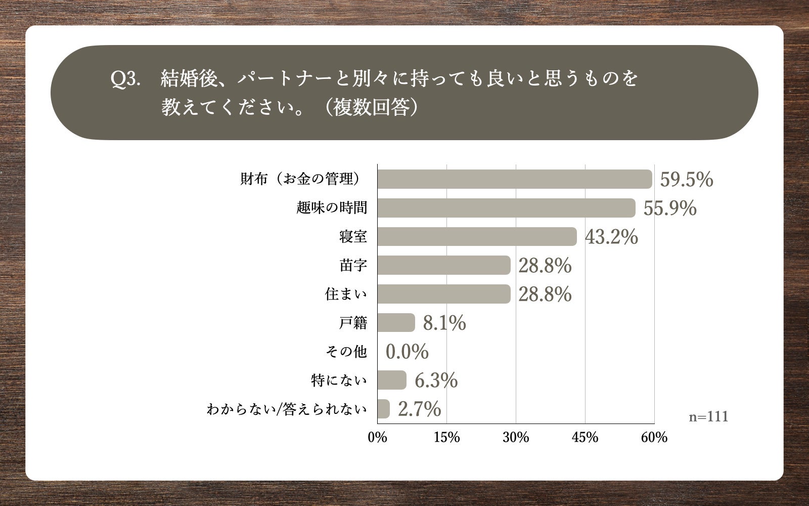 「Q3.結婚後、パートナーと別々に持っても良いと思うものを教えてください。(複数回答)」(n=111)と質問したところ、「財布(お金の管理)」が59.5%、「趣味の時間」が55.9%、「寝室」が43.2%という回答となりました。