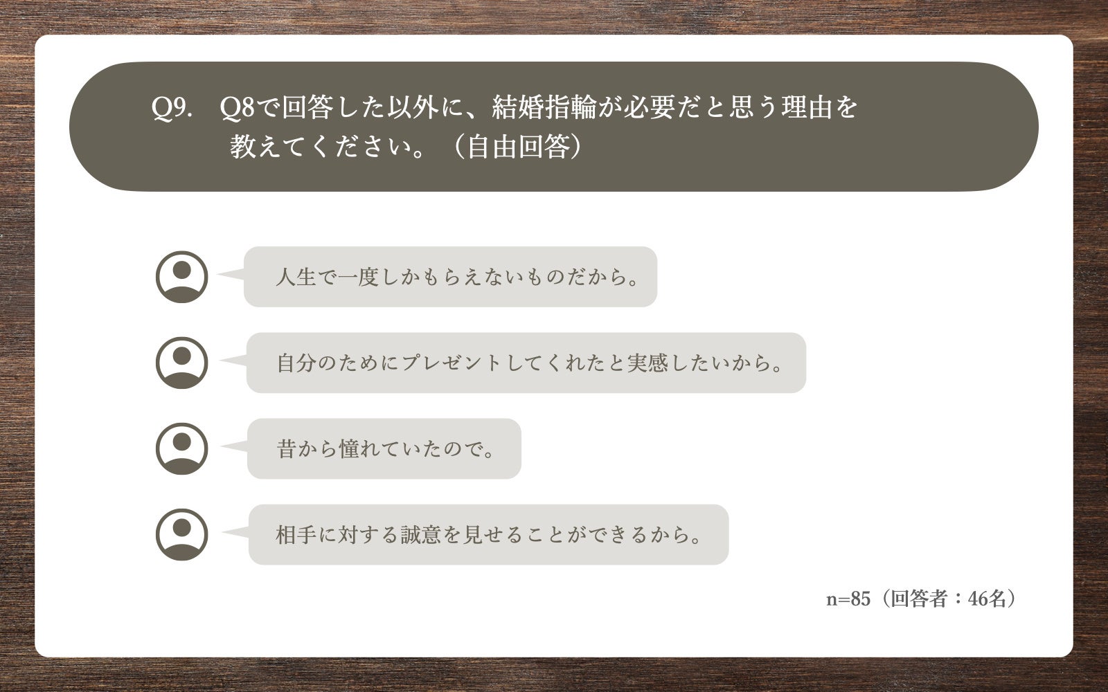 Q8で「わからない/答えられない」以外を回答した方に、「Q9.Q8で回答した以外に、結婚指輪が必要だと思う理由を教えてください。(自由回答)」(n=85)と質問したところ、「人生で一度しかもらえないものだから」や「自分のためにプレゼントしてくれたと実感したいから」など 46の回答を得ることができました。