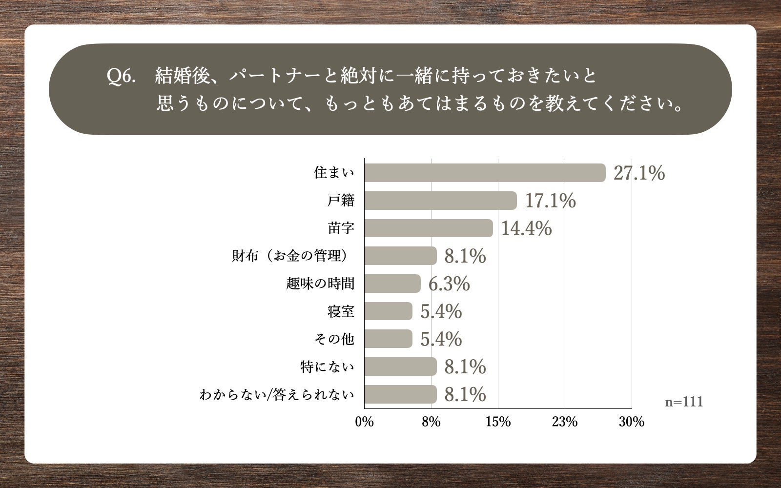 「Q6.結婚後、パートナーと絶対に一緒に持っておきたいと思うものについて、もっともあてはまるものを教えてください。」(n=111)と質問したところ、「住まい」が27.1%、「戸籍」が17.1%、「苗字」が14.4%という回答となりました。